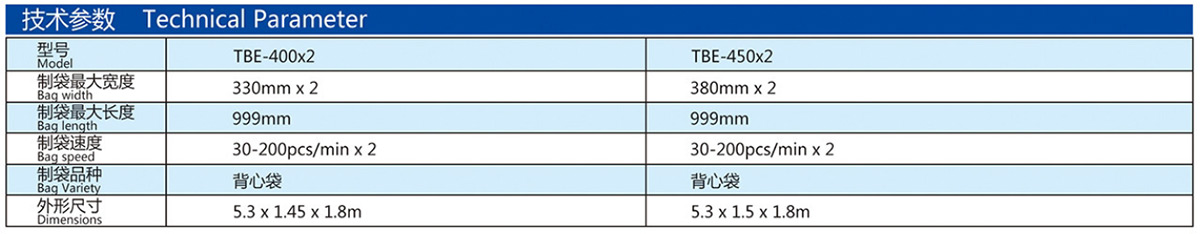 機器特性 該機適用于對高密度聚乙烯(HDPE),低密度聚乙烯(LDPE)筒狀本色和彩印塑料薄膜進行熱封熱切制袋,雙刀雙道生產線,配備機械手自動沖,從送料、封底、切斷、沖口、折袋、輸送一次性完成,自動