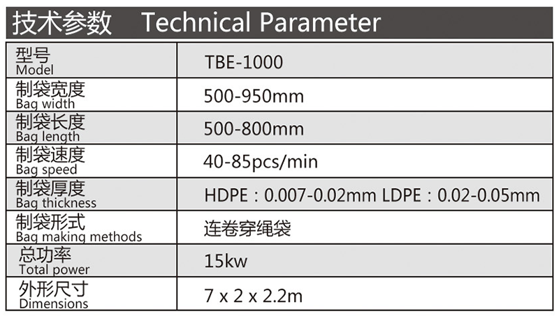 機(jī)器特性 此設(shè)備為生產(chǎn)連卷穿繩袋的專(zhuān)用設(shè)備,制袋速度快,調(diào)節(jié)簡(jiǎn)單。此設(shè)備采用全鋼板一體而成,用電220v照明電即可。